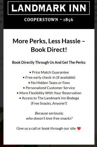 A charming nineteenth century bed and breakfast, the Landmark Inn stands proudly in the heart of historic Cooperstown, New York. Situated on two acres in the center of the village, the Landmark Inn offers a convenient, comfortable home for guests enjoying a memorable family vacation, a successful business gathering, an exploration of the Leatherstocking region, or a reunion with friends and family. With a spacious back lawn, the inn is the perfect place for small receptions and other gatherings.