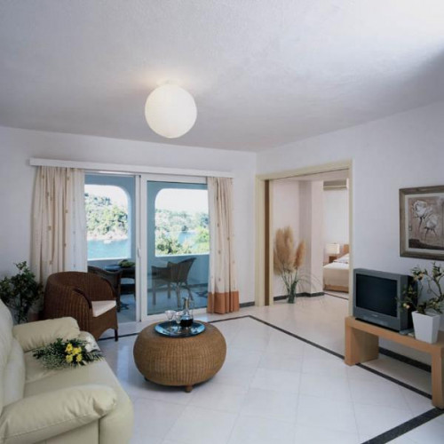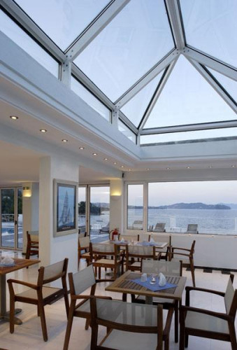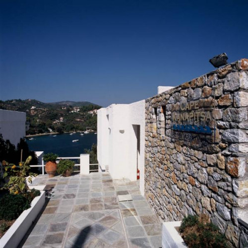 Hotel Cape Kanapitsa of Skiathos unique location on the rocks of the «Cape of Kanapitsa» on the Kalamaki Peninsula 7km from the town, port and airport, along with the renovations and extensions that were completed last winter, give a fair advantage to our hotel. A short walk through the gardens brings one to the marvellously situated swimming pool and poolside bar where breakfast is taken and where light snacks are available throughout the day with a splendid view over the sea. The spacious, elegant marble-floored reception - lounge, with satellite TV, of Hotel Cape Kanapitsa of Skiathos is overlooking the Tzaneria Bay.The two beaches below the Hotel Cape Kanapitsa of Skiathos (100 meters walking distance) are some of the finest on the island and both of them offer a full range of water sports as well as beach volley and scuba diving.